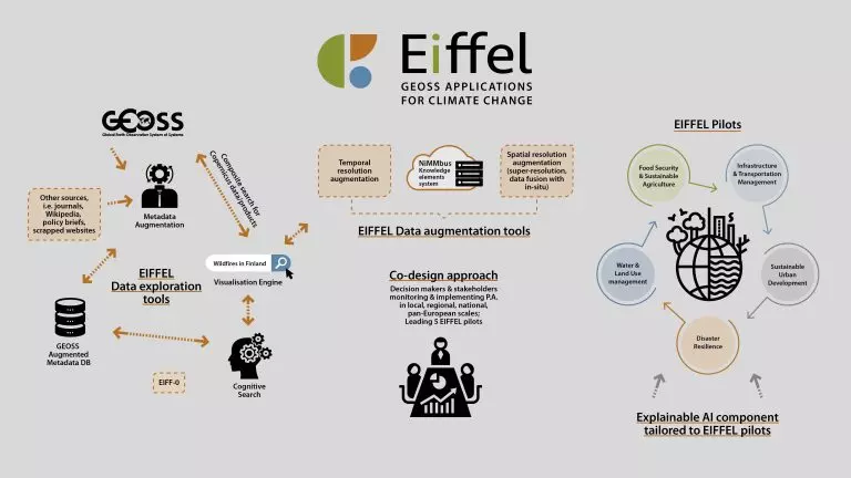 EIFFEL will offer the EO-based community the ground-breaking capacity of exploiting existing GEOSS and external datasets, with minimal new data collection activities. Added-value services interoperable with GEOSS will be designed, using cognitive search and metadata augmentation tools based on Artificial Intelligence (AI), including Natural Language Processing.