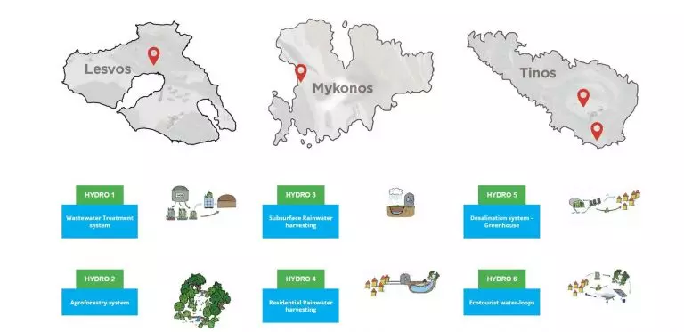 The HYDROUSA concept and solutions are materialised by implementing six demonstration sites at full scale in three Mediterranean islands (Lesvos, Mykonos and Tinos). These demo scale solutions are named HYDRO1-6. Detailed technical and financial deployment plans will be established for replication in additional 25 locations worldwide.