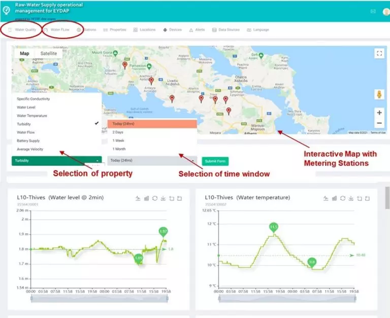 Fiware4Water intends to link the water sector to FIWARE, a curated framework of open-source platform components that aims to accelerate the development of interoperable and portable smart solutions. Our role in the project concerns the development of digital information platforms and analytics that are seamlessly interlinked and integrate with external platforms and data sources following the standardization specifications of FIWARE (i.e., NGSI-v2 and NGSI-LD). Specifically, we develop analytics to support the optimal management and control of the external raw-water supply system of EYDAP, that serves the city of Athens (Greece). A new digital platform (based on the in-house Nessie technology) for the collection, process, analysis and visualization of real-time information from the network of sensors in the conveyance system is being developed, integrating the legacy systems (existing sensors and databases) into a common information system, using FIWARE. The platform is coupled with ML and physically-based models to support the operational staff in decision making, by providing forecasts and early-warnings for the critical quality and quantity (hydraulic) aspects (e.g., flow, turbidity, water volumes) of the system.