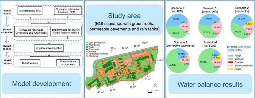 To assess the performance of BGIs in mitigating floods and droughts in an urban area, a water balance model was developed in this study to simulate runoff formation and propagation.